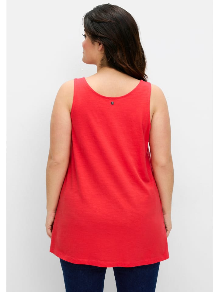 Топ слегка расклешенного, удлиненного фасона. Благодаря слегка глубокому V-образному вырезу и закрытой спине он прекрасно сочетается со многими летними образами. Фиксированный узел на бретеле - красивая деталь. Высокие разрезы по бокам обеспечивают свободу движений и комфорт.