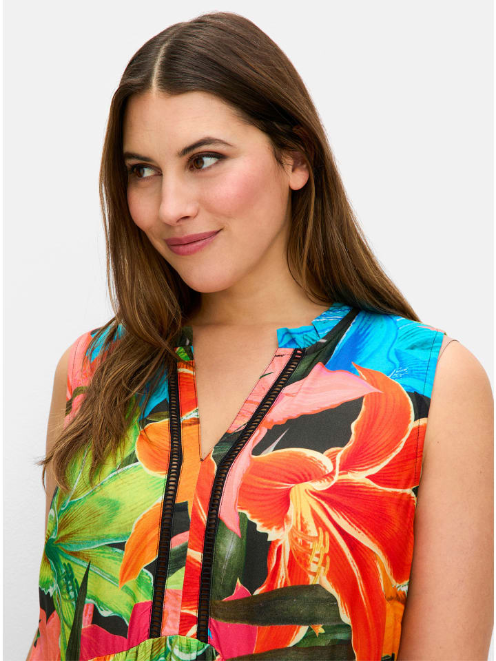 Платье макси-длины. Благодаря красочному цветочному принту и крою без рукавов, платье олицетворяет чистое летнее настроение. Высокая кокетка спереди выгодно подчеркивает область живота и придает широкой многоярусной юбке особую пышность. Вырез оформлен небольшой оборкой и ажурной лентой, а кокетка сзади также декоративно подчеркнута контрастной лентой. Дополнительным элементом является застежка-молния в боковом шве.