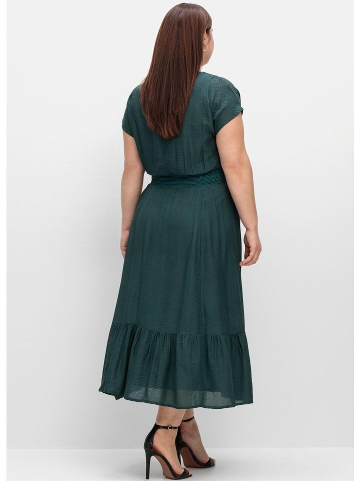 Платье макси с короткими спущенными рукавами. Тонкий фактурный узор визуально разбавлен контрастным сборкой на поясе. Расклешенная юбка имеет присборенный разделительный шов, создающий развевающийся обор. Декоративные складки сзади на вырезе обеспечивают свободную посадку по фигуре.