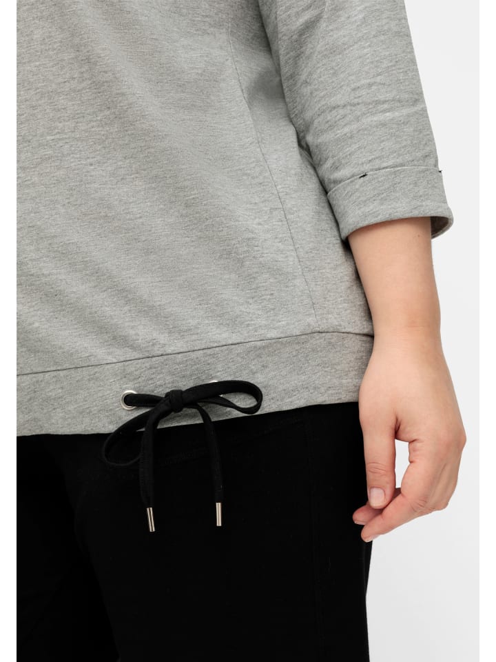 Свободная рубашка удобного свободного кроя. Рукава длиной 3/4 с отворотами и регулируемая кулиска по подолу создают спортивный образ. Текстовый принт под узким круглым вырезом служит модной деталью.