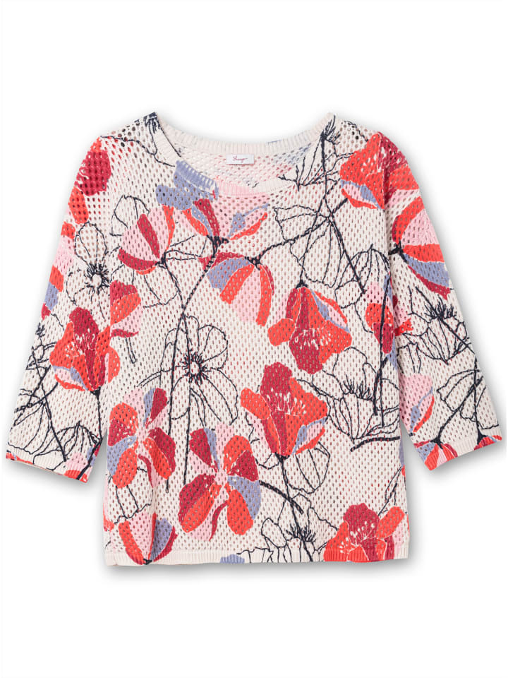 Ажурный трикотажный свитер. Прозрачный ажурный трикотаж дополняется крупным красочным цветочным принтом по всей поверхности. Свободный крой с рукавами длиной 3/4 и спущенным плечом создает современный силуэт.
