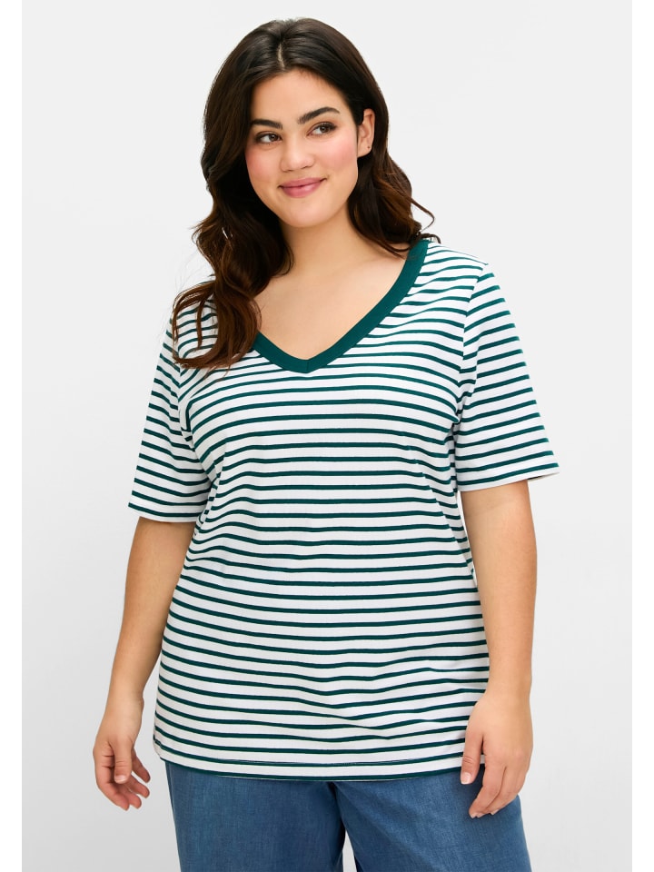 Рубашка с полосками, окрашенными пряжей. V-образный вырез спортивно подчеркивается контрастной отделкой, а широкая рубчатая структура добавляет упругости поверхности. Немного удлиненный рукав и прямой крой дополняют образ.