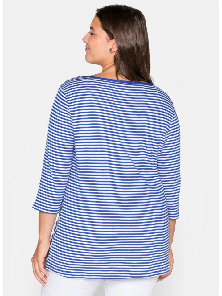 Рубашка в рубчик с рукавами длиной 3/4. Полоски из окрашенной пряжи придают рубашке морской шарм. Образ дополняют круглый вырез горловины и прямой подол.