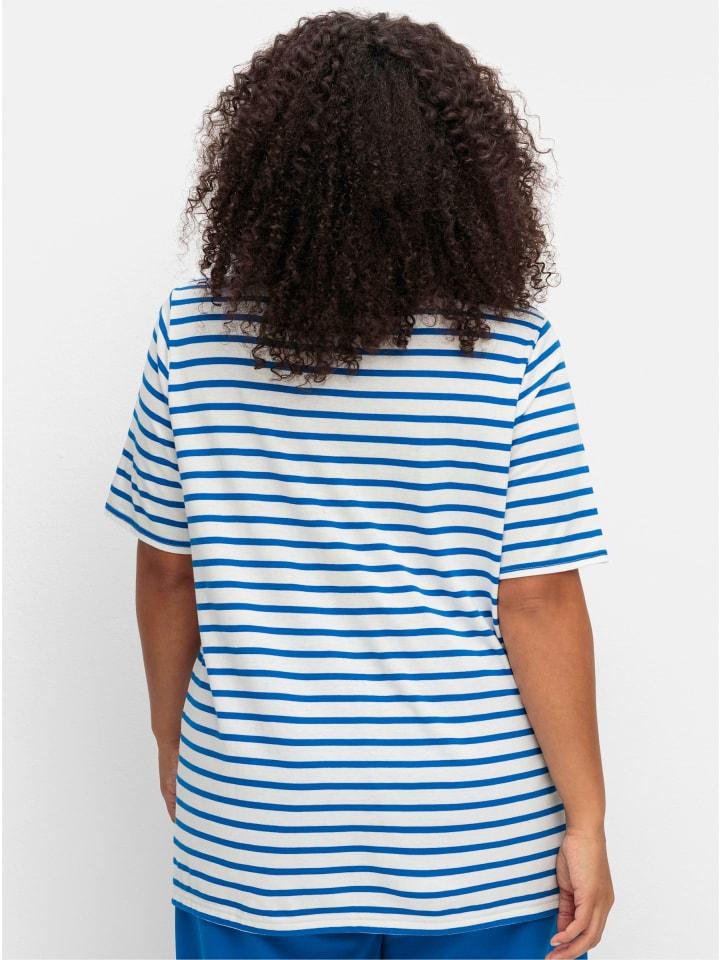 Рубашка с полосками, окрашенными пряжей. Морской полосатый рисунок женственно дополняется узкой кружевной отделкой по круглому вырезу. У рубашки рукава до середины икры, а прямой подол заканчивается боковыми разрезами.