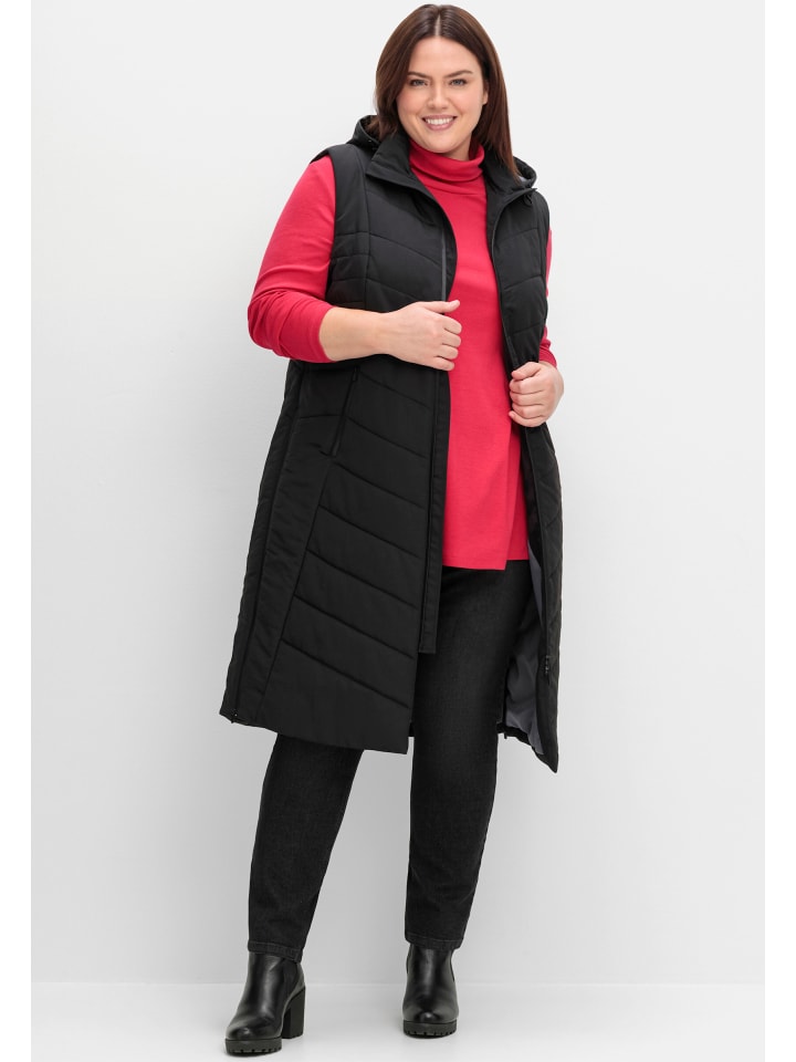 Длинный стеганый жилет с регулируемым капюшоном. Сужающаяся по центру стежочка и визуально контрастирующая по бокам придает жилету современный вид, одновременно искусно удлиняя фигуру. Двусторонняя молния, которую также можно расстегнуть снизу, и высокие молнии, встроенные в боковой шов, обеспечивают оптимальный комфорт и большую свободу движений. Два кармана для рук на подкладке из уютного флиса, а внутренний карман на пуговице придает практичность.