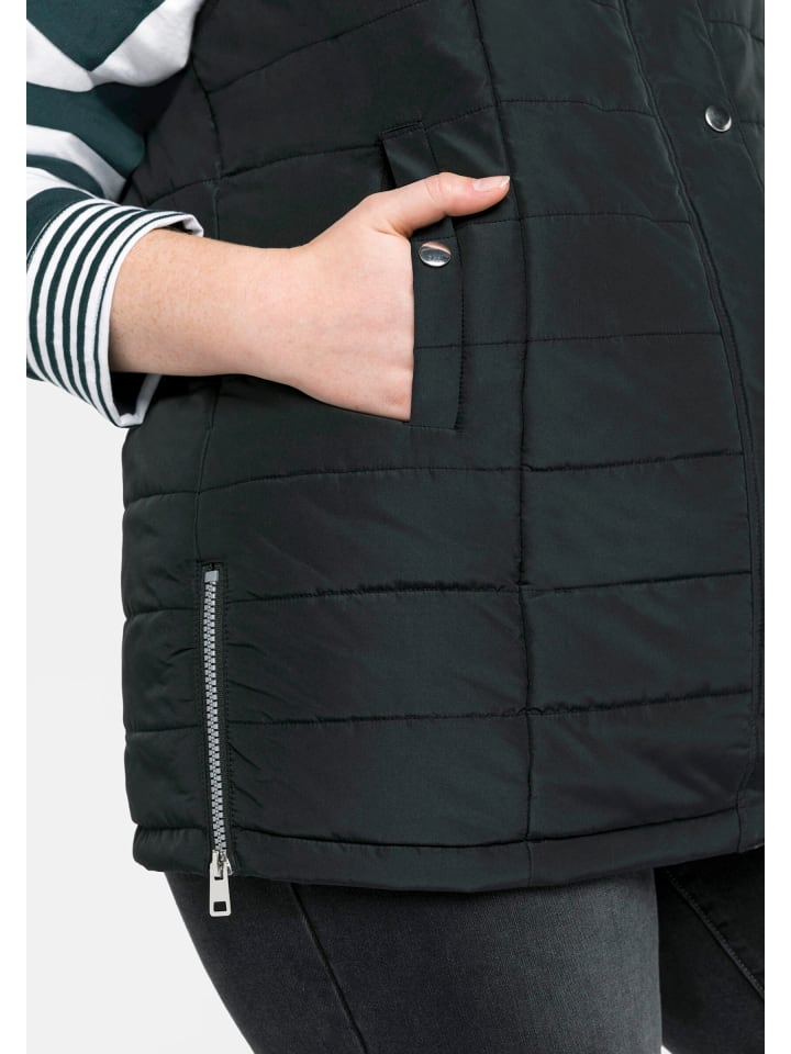 Длинный стеганый жилет со съемным капюшоном и кулиской. Эффектная стежок и воротник-стойка подчеркивают спортивный вид. Модель застегивается на одностороннюю молнию и кнопки. Два практичных прорезных кармана расположены спереди, а молнии по бокам обеспечивают дополнительную свободу движений.
