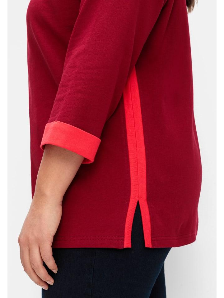 Толстовка с контрастными деталями. Простой фасон приобретает модный вид благодаря контрастным деталям. Строгий вырез горловины лодочка дополнительно подчеркивается контрастной вставкой и декоративными пуговицами на плече. Отворот по низу рукава длиной 3/4 также привлекает внимание. Контрастные вставки в боковых швах искусно удлиняют фигуру, а боковые разрезы обеспечивают свободу движений.