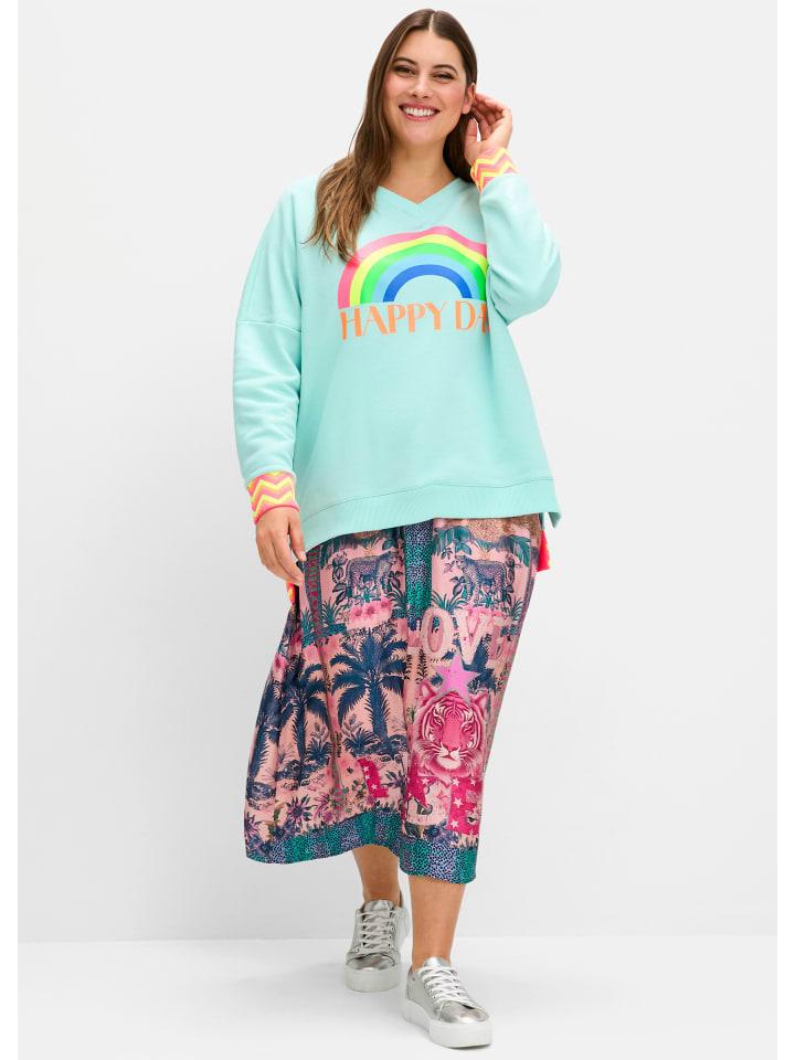 Толстовка с модными акцентами от sheego loves miss goodlife. Веселый эффектный принт спереди придает свитеру особый шарм. V-образный вырез и спущенные рукава создают непринужденный силуэт. Эффектные зигзагообразные полоски на манжетах добавляют современный штрих в образ.