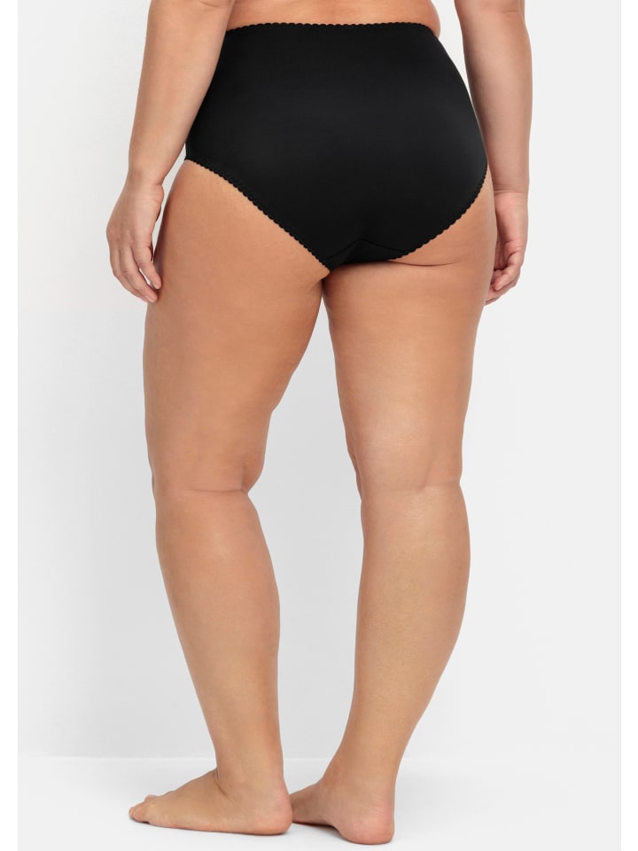 Эти трусики с высокой талией сочетают в себе высокий комфорт при ношении и женственную утонченность. Прозрачные кружевные вставки придают модели пикантность, а нежные фестончатые края по периметру также выглядят игриво и удобно.