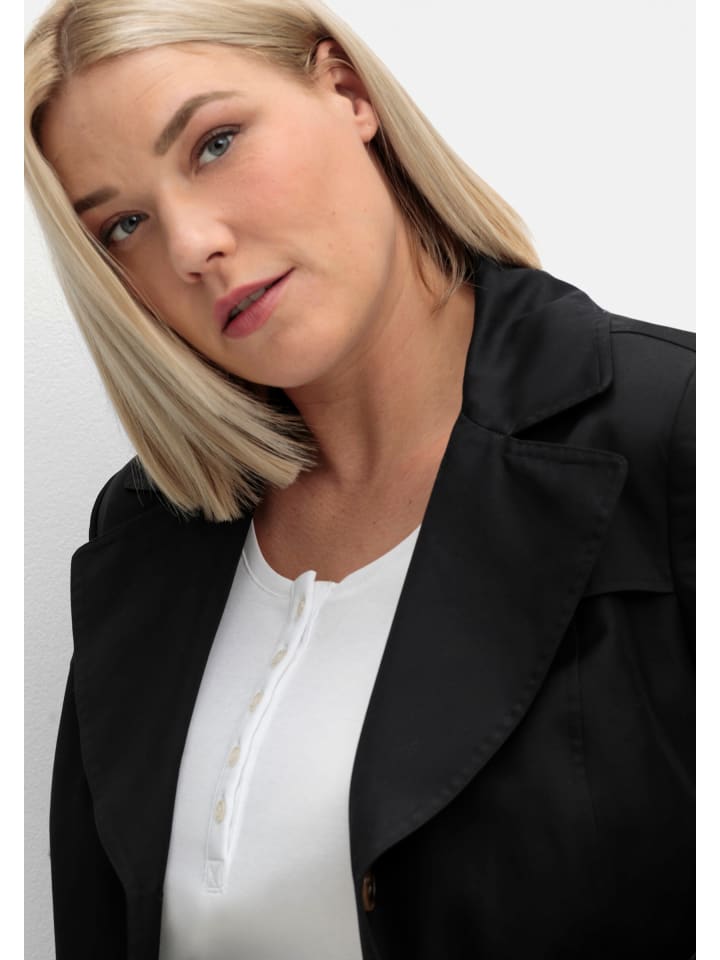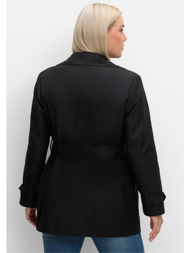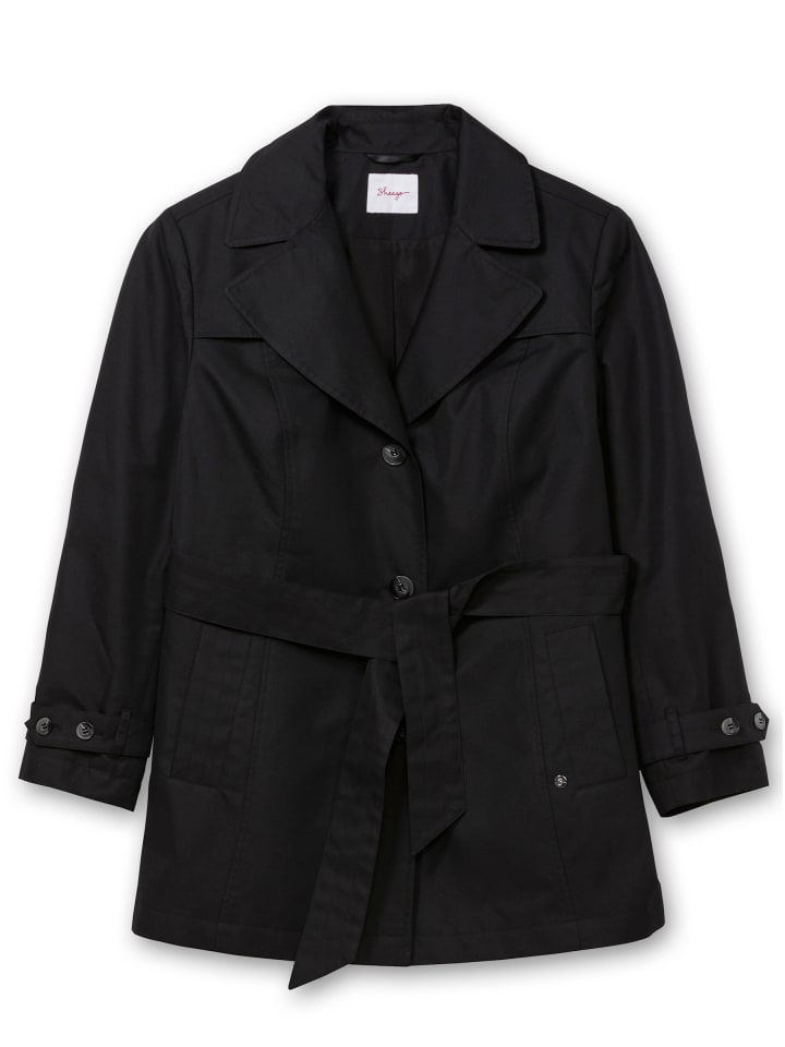 Укороченный тренчкот. Это стильное переходное пальто с отложным воротником, свободной кокеткой, планкой на пуговицах и широким поясом. Регулируемые хлястики на рукавах привлекают внимание. Также есть два прорезных кармана и разделительные швы спереди и сзади.