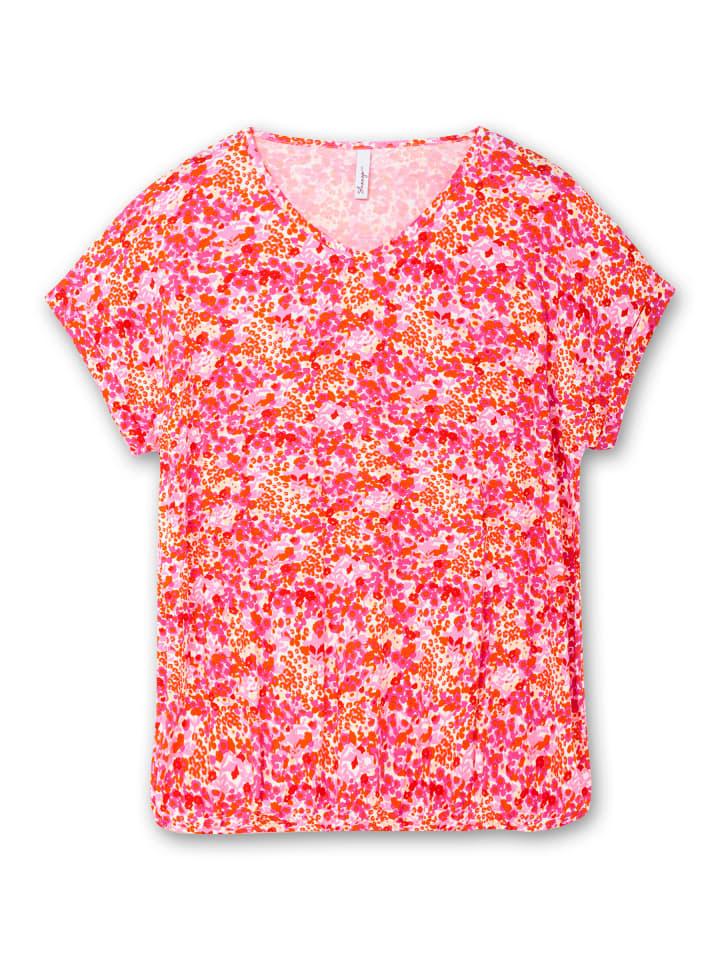 Футболка с цветочным принтом. Приталенные однотонные манжеты создают модный контраст с нежным цветочным узором. К этому добавляются узкий V-образный вырез и непринужденно спущенные плечи. Эластичный пояс собирает свободный подол и создает комфортную ширину в области живота.
