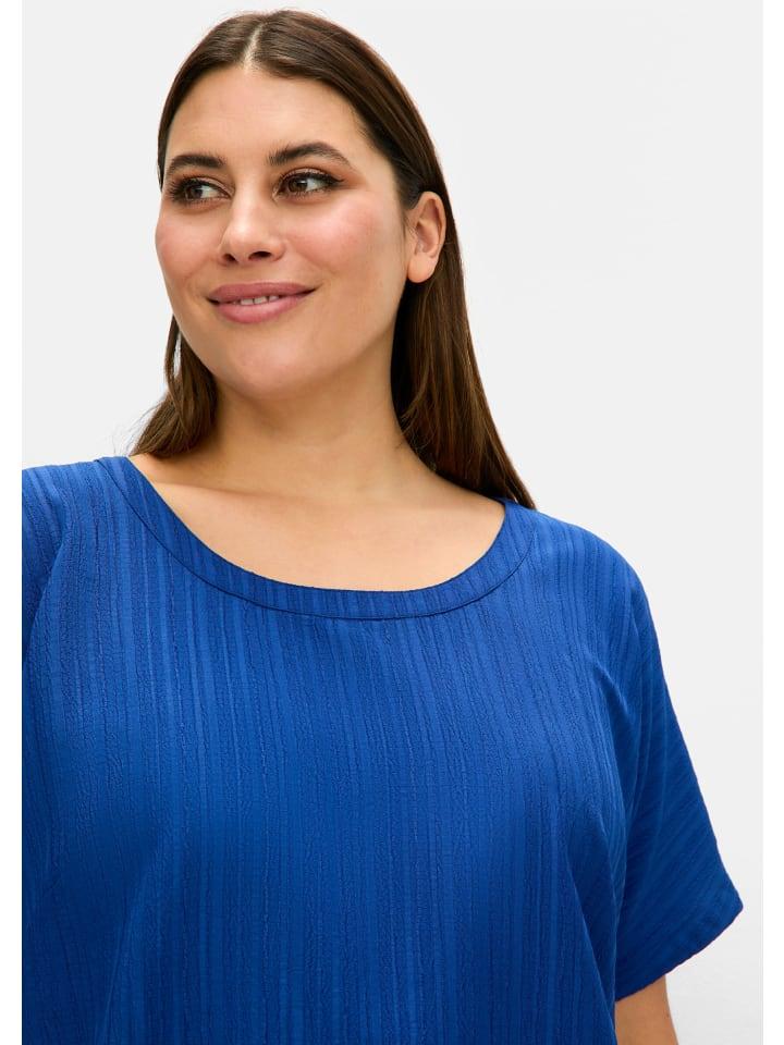 Туника с фактурными вертикальными полосками. Круглый вырез спереди искусно дополнен сзади V-образным разрезом с перекрещенными лентами. Спущенное плечо и свободный крой обеспечивают удобную посадку, а прямой подол с боковыми разрезами - дополнительную свободу движений.