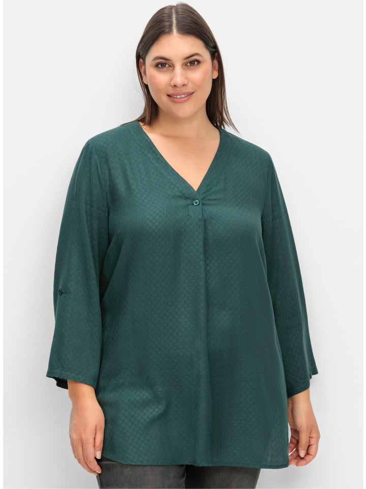 Туника со структурированным внешним видом. V-образный вырез с пуговицей и декоративной складкой. Длинные рукава регулируются по длине и застегиваются на хлястики и пуговицы. Кокетка сзади обеспечивает удобную посадку и красивую драпировку.