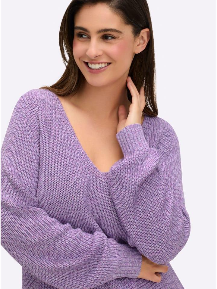 Свитер из ребристого трикотажа. Пестрая разноцветная пряжа придает поверхности живой вид. Он также имеет женственный V-образный вырез и удобные эластичные манжеты. Бахрома по подолу добавляет модный штрих.