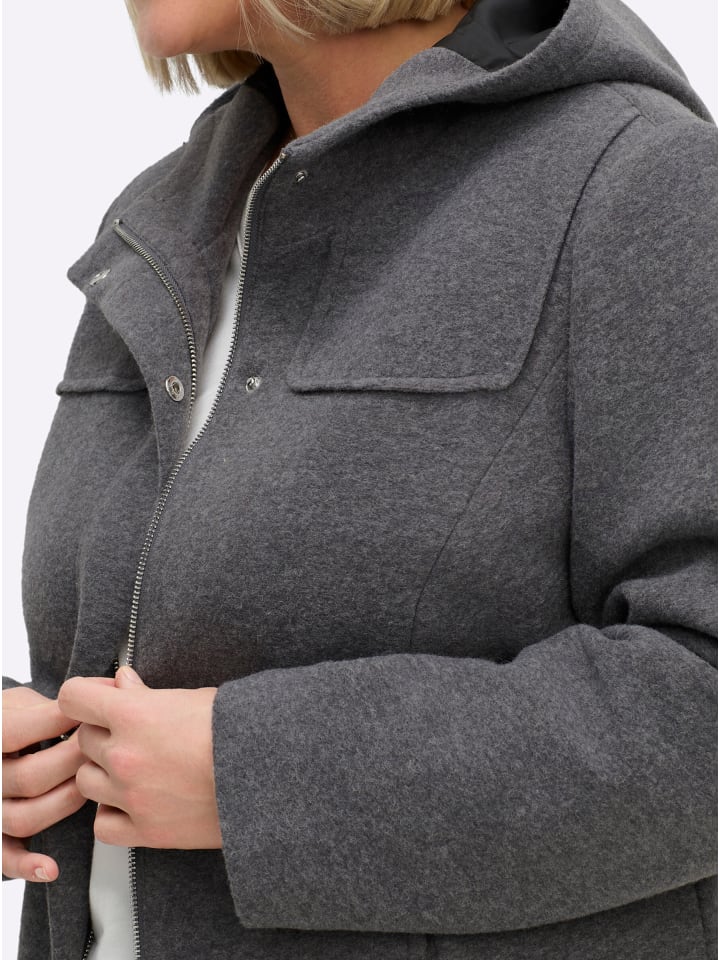 Зимнее пальто с накладной кокеткой на плечах для стильного образа. Сдержанные подплечники создают гармоничный силуэт, а потайная молния с кнопкой обеспечивает четкие линии кроя. Практичные детали, такие как потайная шлица сзади и внутренний карман, делают пальто функциональным спутником в холодные дни.