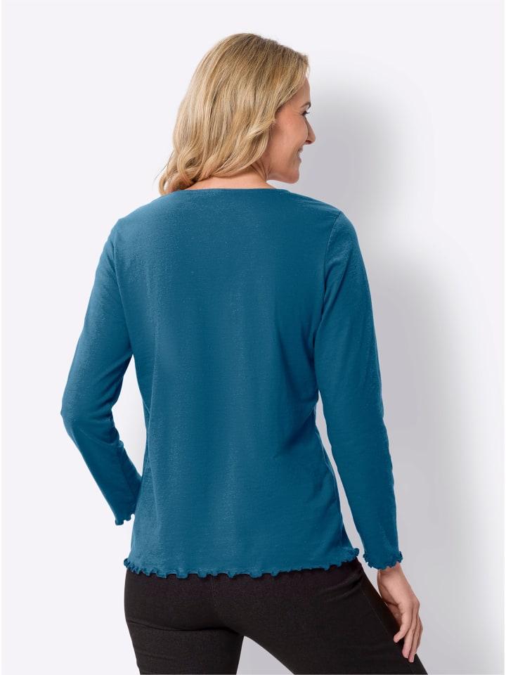 Эта рубашка 2 в 1 - отличный базовый вариант на каждый день! Круглый вырез с однотонной вставкой, открытый V-образный вырез и 3 декоративные пуговицы. Волнистая отделка на длинных рукавах и подоле. Одинарный трикотаж.