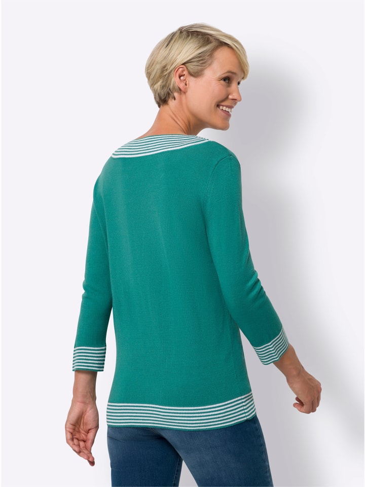 Этот тонкий и очень удобный свитер с V-образным вырезом, широкой полосатой отделкой на горловине, рукавами длиной 3/4 и подолом доступен по выгодной цене. Ребристые манжеты также включены.