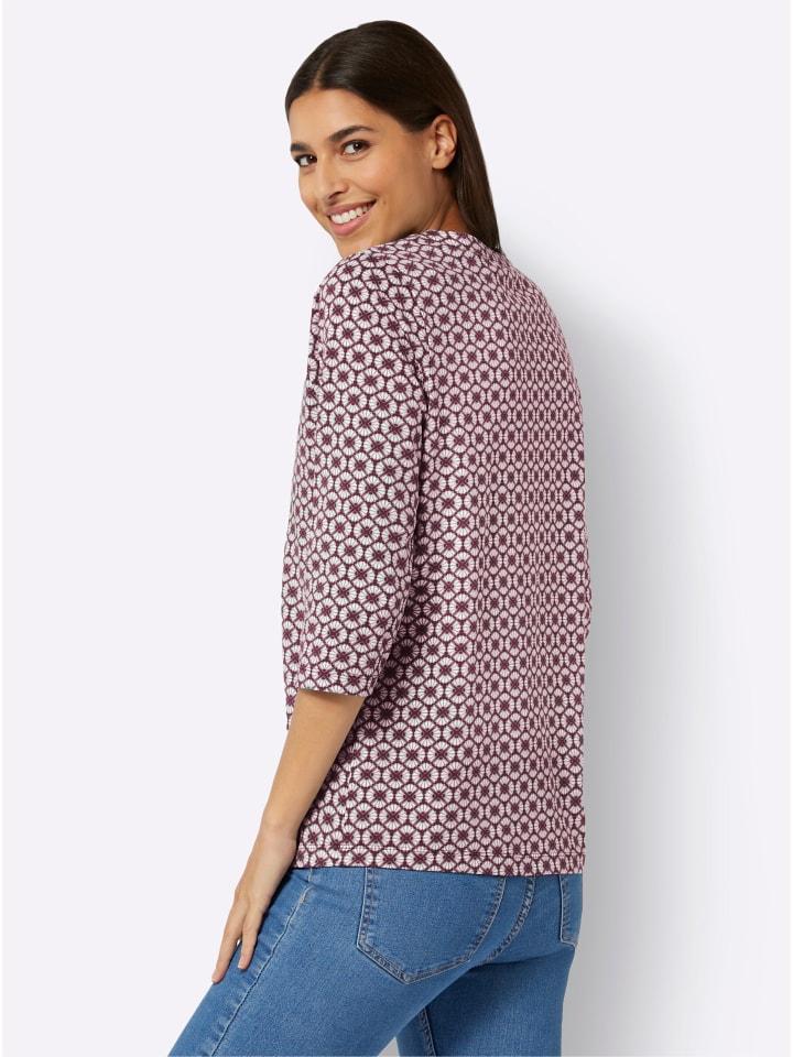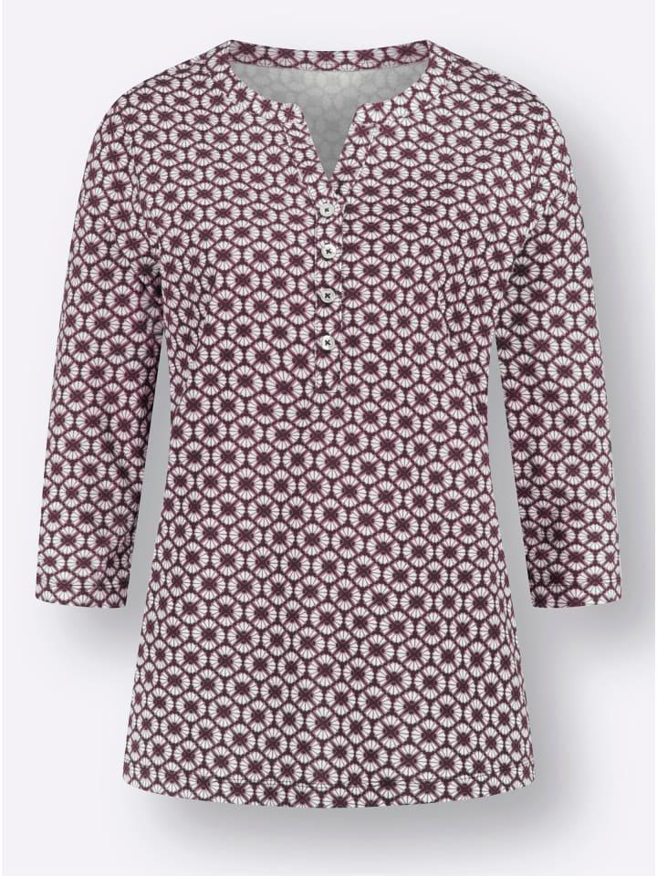 Ретро-узоры в тренде! Эта рубашка с принтом по всей поверхности и рукавами 3/4 сразу же бросается в глаза. Круглый вырез горловины с небольшим V-образным вырезом и короткая планка с пуговицами. Качество, приятное для кожи.