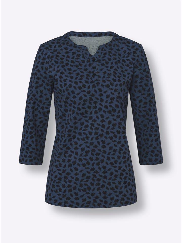 Множество маленьких листьев создают привлекательный узор на этой рубашке с рукавами 3/4. Круглый вырез горловины с небольшим V-образным вырезом и короткая планка с имитацией пуговиц.