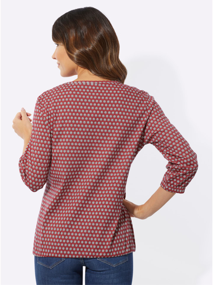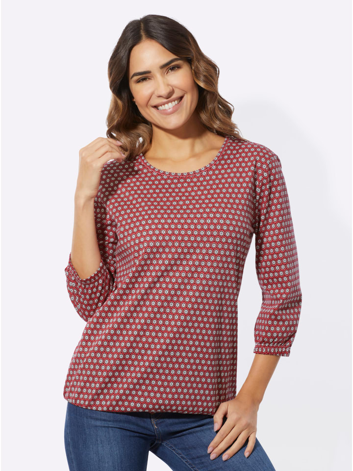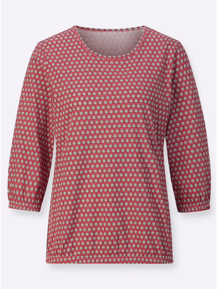 Мини-модель с макси-эффектом: рубашка с рукавами 3/4 и графичным минималистичным рисунком по всей поверхности. Круглый вырез горловины с окантовкой и эластичные манжеты на рукавах и подоле. Одинарный трикотаж.