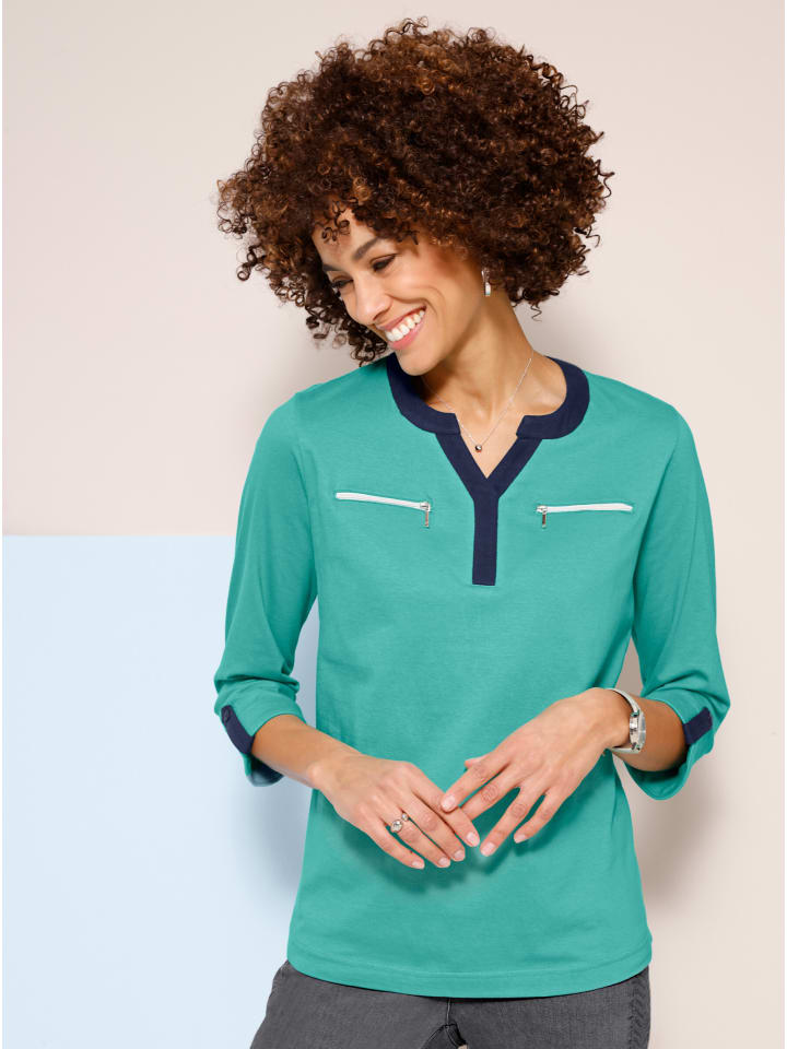 Эта рубашка с рукавами 3/4 мгновенно поднимет вам настроение и создаст сияющий образ! Круглый вырез с небольшим V-образным вырезом и приталенные манжеты контрастного цвета. Два кармана-имитации на молнии.