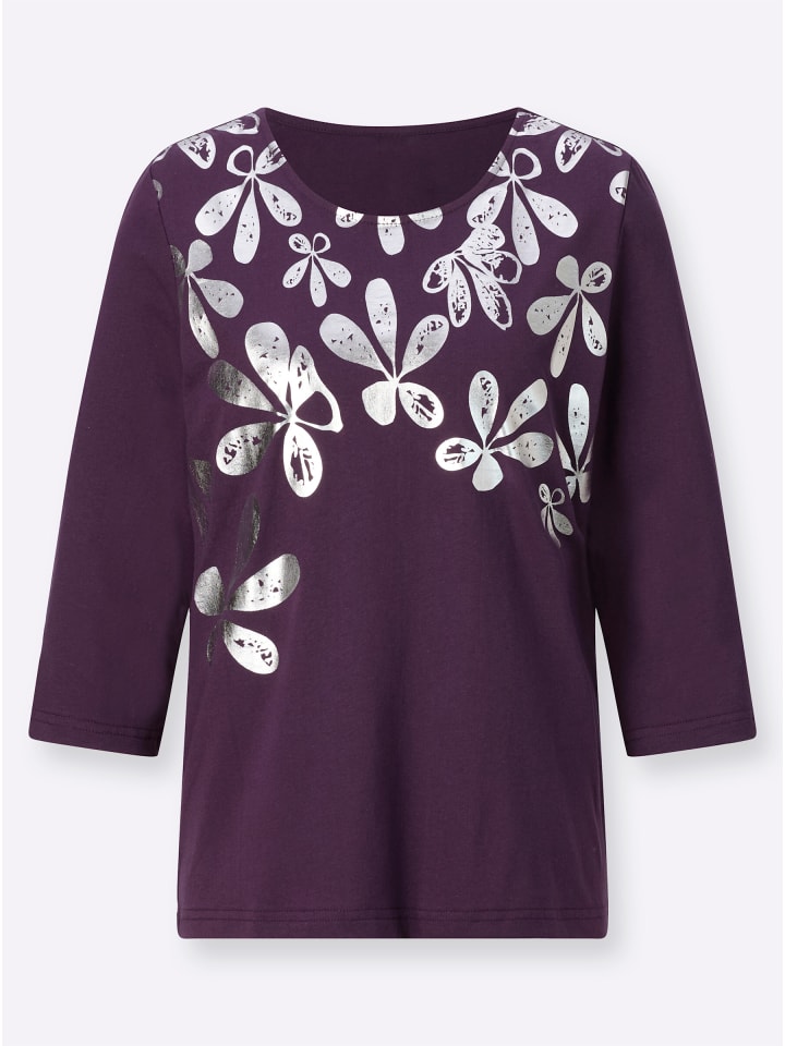 Рубашка с рукавом 3/4 украшена декоративным фольгированным принтом в виде цветов спереди, который нежно мерцает при каждом движении! Комфортный однотонный трикотаж.