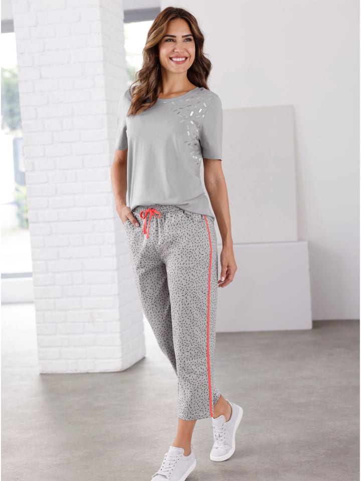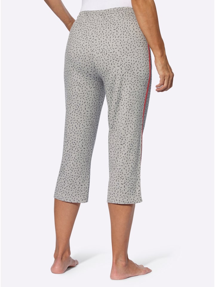 Эти брюки для отдыха длиной 7/8 искусно сочетают графический принт с контрастными деталями. Удобный пояс на резинке по всему периметру со шнурком и завязкой. Два боковых кармана. Контрастная полоска вдоль боковых швов визуально удлиняет фигуру.