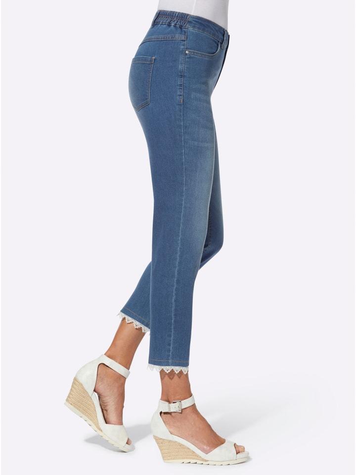 Красивое пришитое кружево на манжетах добавляет романтики этим джинсам длиной 7/8. Удобный эластичный пояс сбоку, шлевки для ремня и застежка на пуговицу и молнию спереди. Два передних кармана и два накладных кармана сзади. Сзади приталенная кокетка. Без ремня. Ширина до щиколотки: около 30 см. - Кружево на манжетах. - Удобный эластичный пояс сбоку. Состав: - 81% хлопок - 17% полиэстер - 2% эластан.
