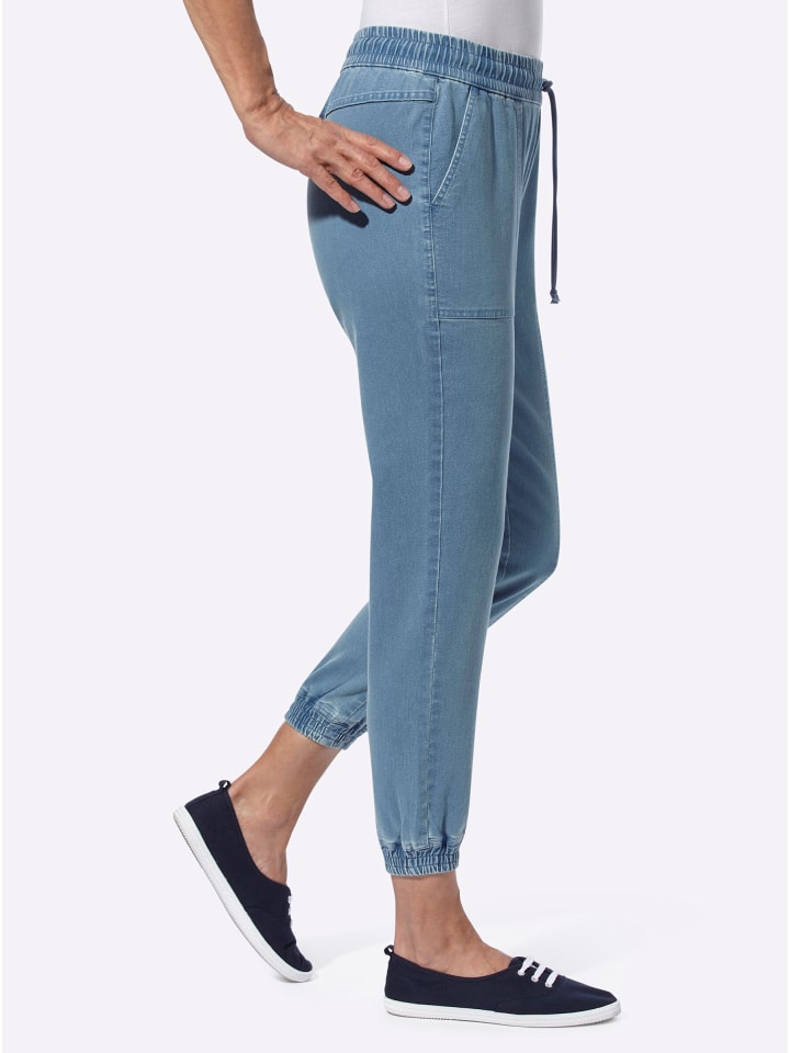 Эти джинсы длиной 7/8 - легкие, летние, не сковывают движений и всегда невероятно удобные. Лучше всего побаловать себя другими расцветками этой универсальной пары. Эластичный пояс по всему периметру с кулиской и шнурком, а также два больших передних кармана. Визуально эластичные разделительные швы спереди и приталенная кокетка сзади. Эластичные манжеты по низу обеспечивают свободную посадку. Ширина до щиколотки: примерно 28 см.