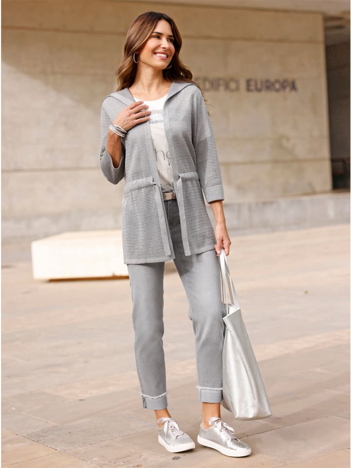 Эти джинсы длиной 7/8 могут многое предложить с точки зрения моды! Слегка потертые. Фигурный пояс со шлевками для ремня и застежкой на пуговицу и молнию спереди. 2 передних кармана. Сзади приталенная кокетка и 2 накладных кармана сзади. Особенно привлекательны отвороты с бахромой и трехцветными стразами по бокам. Ширина до щиколотки примерно 34 см. Без пояса.