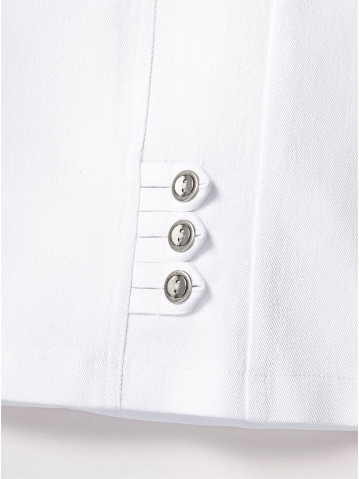 Джинсы длиной 7/8. Эластичный пояс по всему периметру с имитацией молнии. 2 закругленных кармана с заклепками. Декоративные петли и пуговицы на концах брючин.
