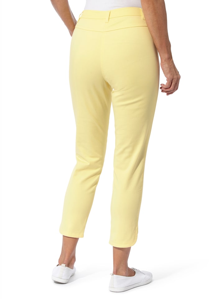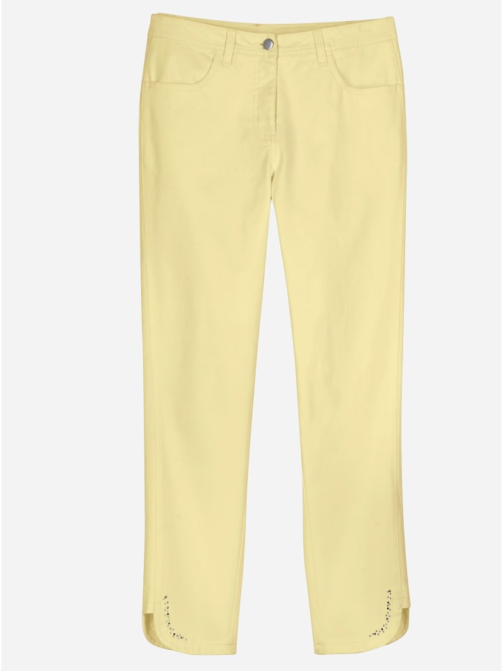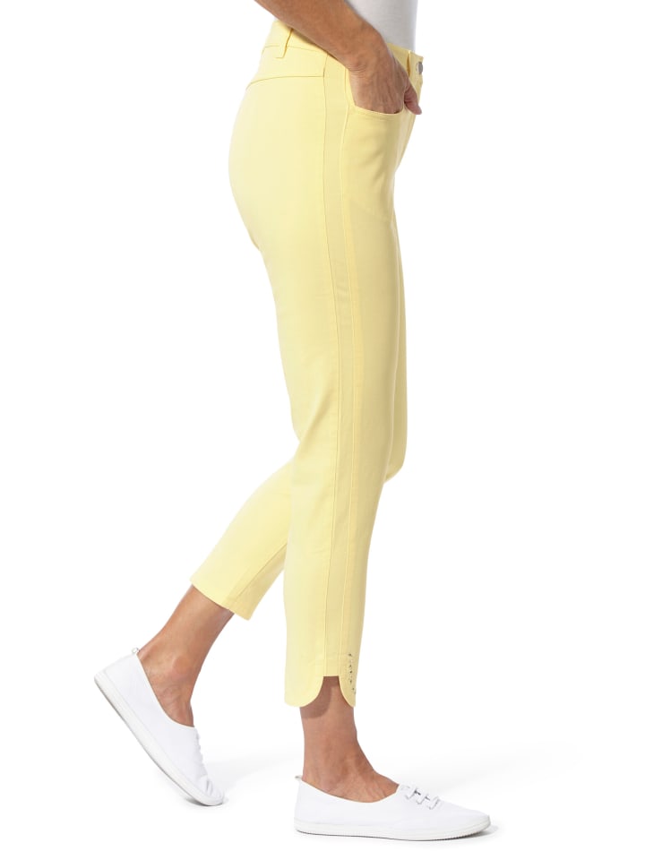 Легко комбинировать и детализировать: джинсы 7/8 с фигурным поясом, шлевками для ремня и застежкой на пуговицу и молнию спереди. Два передних кармана и приталенная кокетка сзади. Боковая вставка создает эффект утягивания. И самое главное - сверкающие стразы на закругленных разрезах по щиколотку. Ширина по щиколотку примерно 32 см. Без пояса.