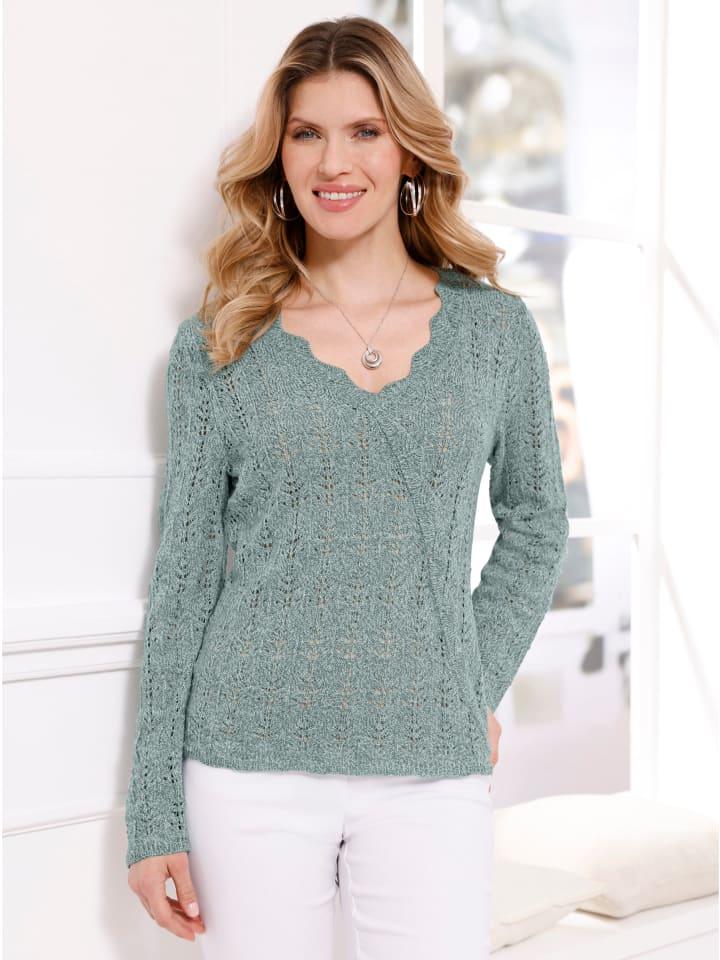 Красивый ажурный свитер с V-образным вырезом, создающий эффект накидки. Ребристые манжеты на длинных рукавах и подоле, а также волнистая отделка на вырезе и переднем крае.