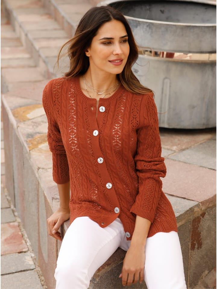 Восхищенные взгляды гарантированы: Великолепный ажурный кардиган с замысловатым вязаным узором по всему периметру - даже на длинных рукавах! Застежка на пуговицах по всей длине с легким мерцанием. Равномерно волнистый низ.