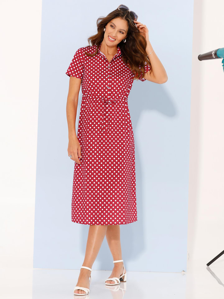 Красивое платье в горошек. Модный воротник-стойка и планка с мраморными пуговицами до бедер. Вытачки на груди, а также кулиска и завязка на талии. Юбка расклешенного А-силуэта.