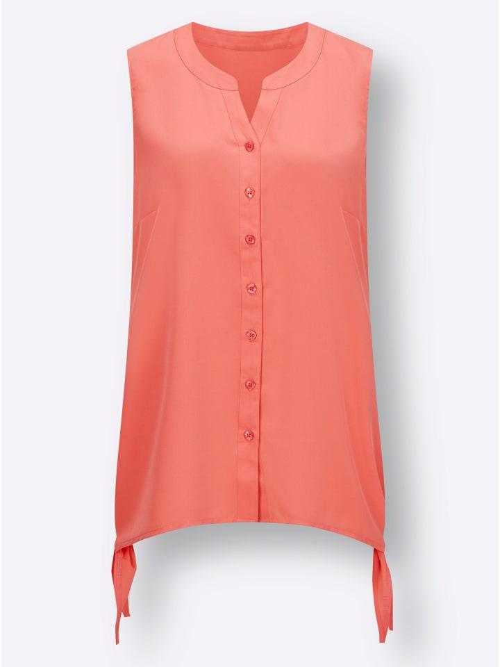Блузка без рукавов красиво облегает фигуру благодаря острому подолу. Круглый вырез с небольшим V-образным вырезом и застежка на пуговицы по всей длине. Вытачки для придания формы груди и боковые разрезы.
