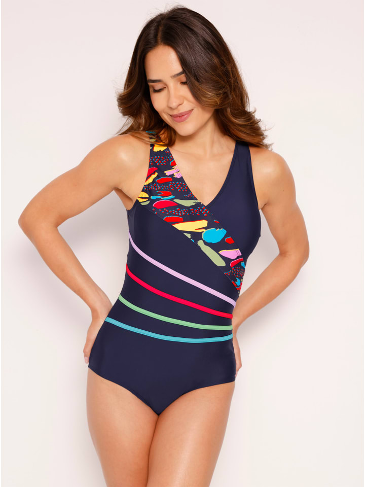 Где бы вы ни прыгали в воду или загорали, этот купальник станет настоящей летней изюминкой! С яркой набивной вставкой и разноцветной окантовкой спереди. V-образный вырез, визуально удлиняющий форму груди, мягкими чашками и поясом под грудью. Передняя часть на плотной подкладке. Закругленная спинка и разделительный шов сзади. - Чашки B, C, D - Набивная вставка на вырезе - С контрастной окантовкой - С мягкими чашками - Пояс под грудью. Состав: - 80% полиамид - 20% эластан