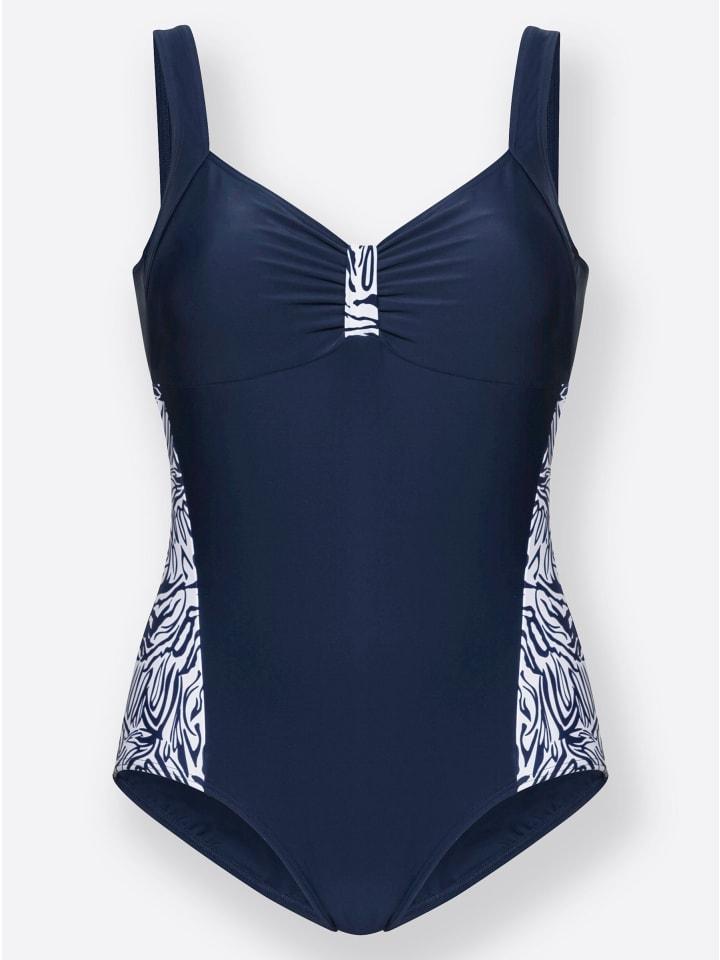 Боковые вставки с рисунком зебры добавляют изюминку. В остальном купальник имеет очень элегантный однотонный крой с V-образным вырезом, мягкими чашками со сборками, поясом под грудью и продуманно расположенными разделительными швами спереди. Передняя часть полностью на подкладке. Закругленная спинка.