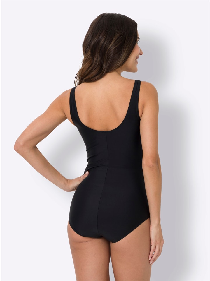 Узор спереди купальника выполнен в освежающих морских тонах. Квадратный вырез, мягкие чашки с поясом под грудью и перед на подкладке. Закругленная спинка.