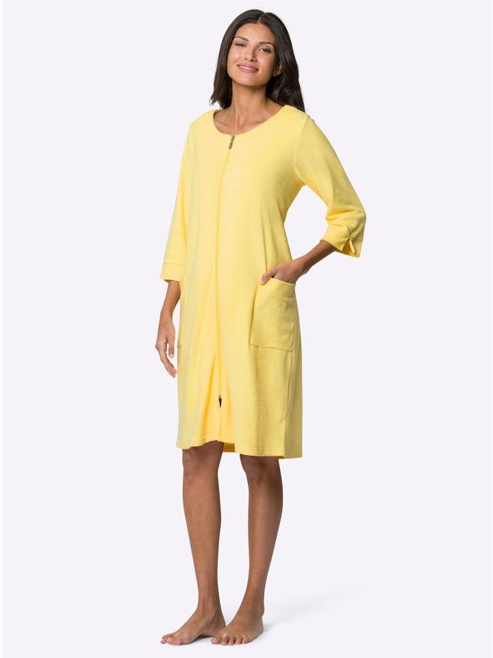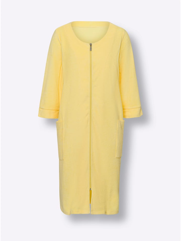 Идеально подходит для занятий велнесом, посещения открытого бассейна или отдыха на пляже: халат из мягкой махровой ткани с круглым вырезом и практичной застежкой-молнией. 2 больших накладных кармана. Рукава длиной 3/4 с разрезом.