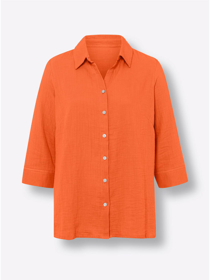 Вам понравится эта блузка из удобного и простого в уходе муслина, которую можно носить как застегнутой, так и расстегнутой поверх рубашки. Она имеет открытый воротник и планку с перламутровыми пуговицами. Рукава длиной 3/4 с манжетами и разрезами.