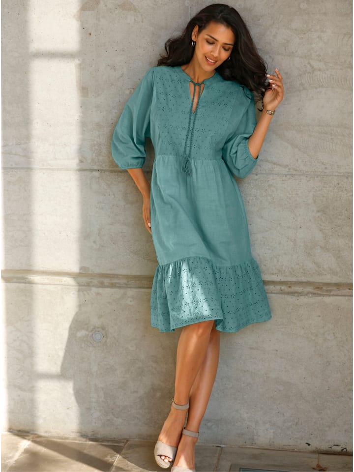 Воздушное, легкое тканое платье с великолепной ажурной вышивкой. Круглый вырез горловины с открытым V-образным вырезом, завязывающийся пояс с кисточками. Рукава летучая мышь длиной 3/4 с эластичными манжетами.