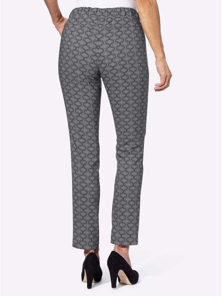 Комфорт по низкой цене: брюки Bengaline с графическим принтом по всей поверхности. Удобная модель, легко надевается, с невидимым эластичным поясом по всему периметру, завязывающимся поясом и имитацией молнии. Два закругленных кармана спереди, приталенная кокетка сзади. Ширина до щиколотки примерно 34 см.