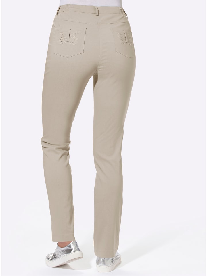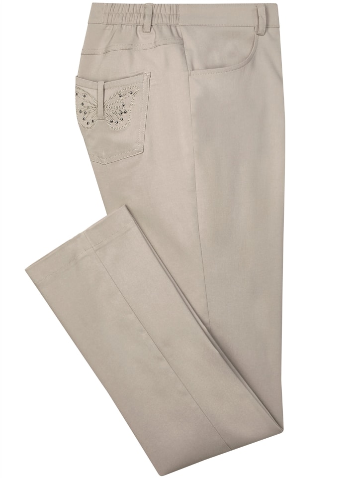Суперэластичные, суперудобные, суперухоженные: эти брюки Bengalin - настоящая универсальная вещь! С эластичным поясом сбоку, шлевками для ремня и застежкой на пуговицу и молнию. Два передних и два задних кармана с милой вышивкой бабочек и заклепками. Ширина до щиколотки примерно 38 см.