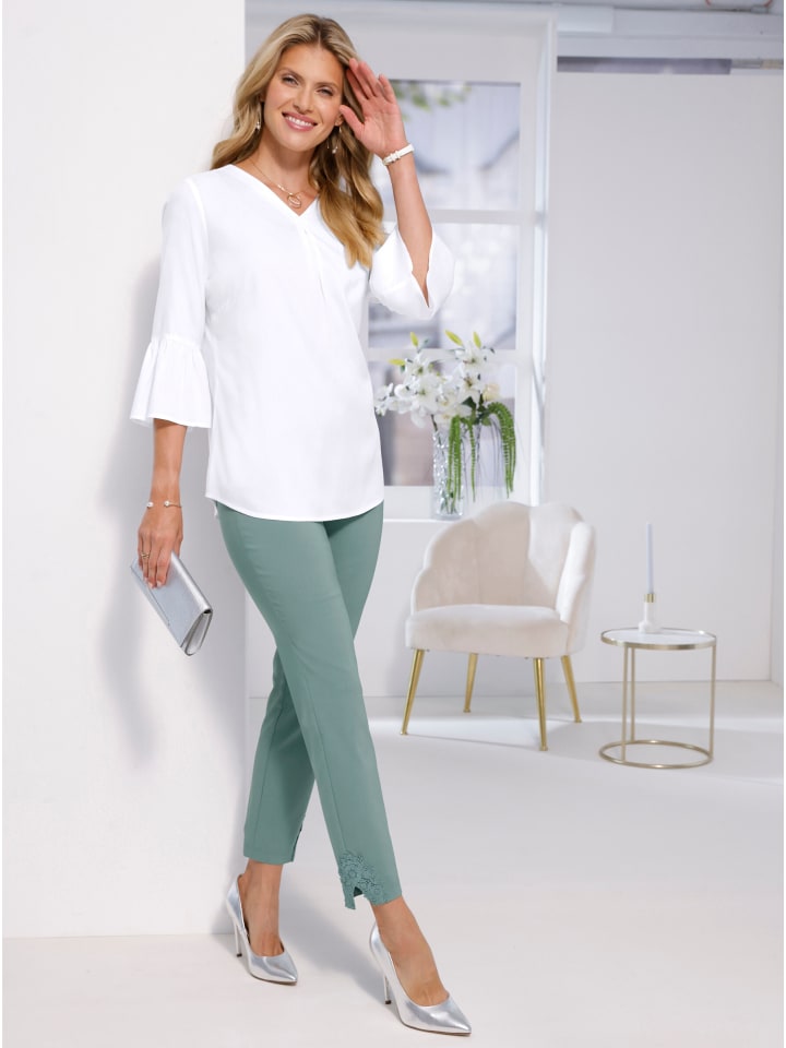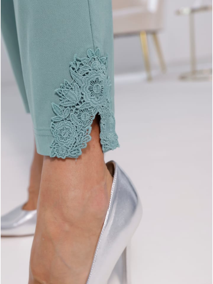 Эти брюки Bengaline украшены кружевом в тон по низу штанин! Чрезвычайно комфортная эластичная ткань с отличной посадкой благодаря круговому эластичному поясу и приталенной кокетке сзади. Два накладных кармана сзади. Ширина до щиколотки: около 34 см. - Кружево по низу штанины. - Длина до щиколотки. Состав: - 72% вискоза - 25% полиамид - 3% эластан.