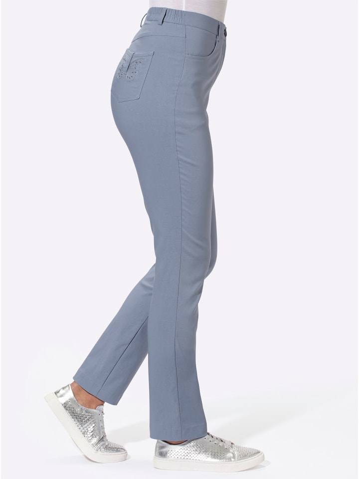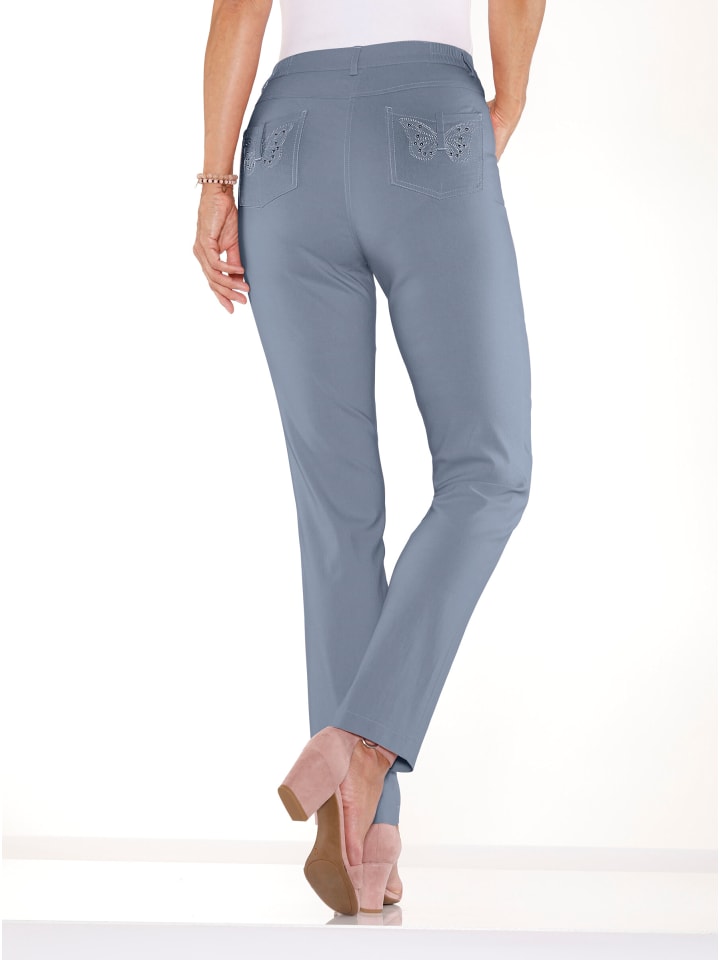 Суперэластичные, суперудобные, суперухоженные: эти брюки Bengalin - настоящая универсальная вещь! С эластичным поясом сбоку, шлевками для ремня и застежкой на пуговицу и молнию. Два передних и два задних кармана с милой вышивкой бабочек и заклепками. Ширина до щиколотки примерно 38 см.