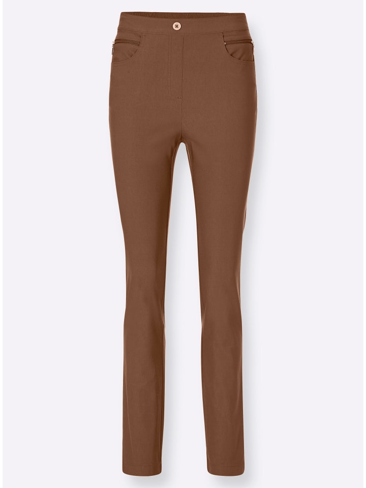 Эти элегантные брюки отлично сидят, идеально сидят и отлично держат форму! С эластичным поясом сзади, декоративной пуговицей и имитацией молнии спереди. 2 кармана и декоративные молнии спереди. Ширина до щиколотки примерно 36 см.