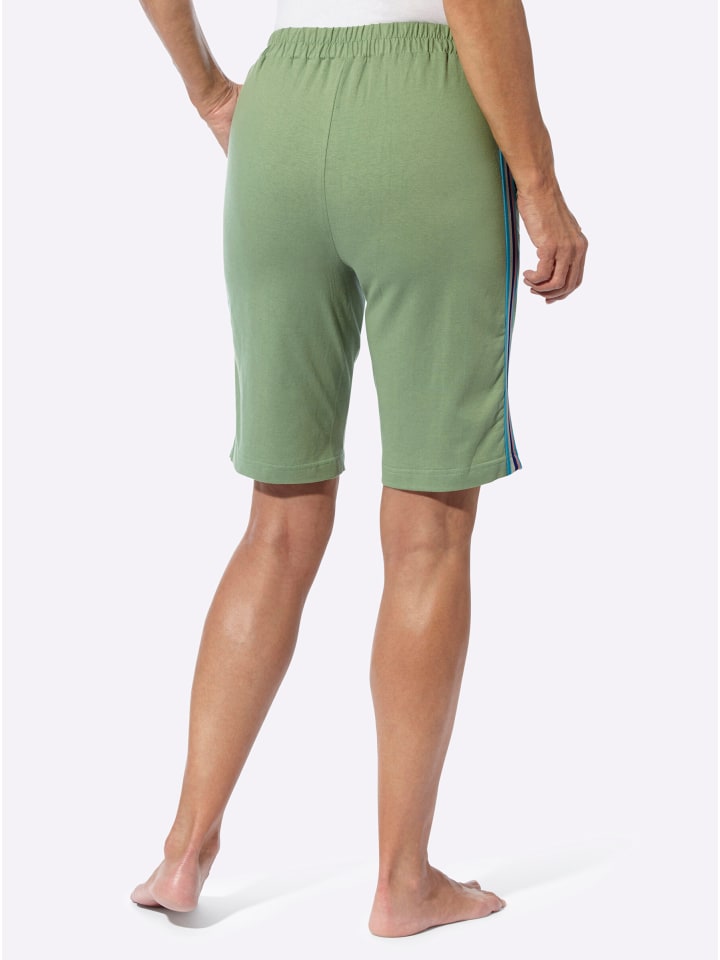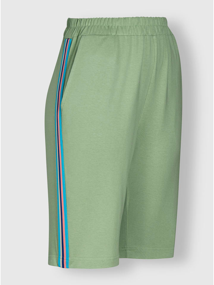 Контрастная полосатая полоска по боковому шву этих удобных шорт-бермуд для отдыха придает им спортивный вид и визуально удлиняет фигуру. Удобный пояс на резинке по всему периметру и два передних кармана.