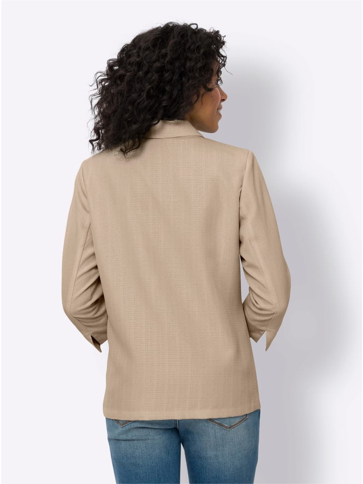 Этот блейзер - идеальный партнер! Лен, имитирующий лен, не только создает элегантную структуру, но и не мнется, а значит, прост в уходе. Визуально удлиняющий воротник с лацканами и ажурные швы. Застежка - красивая пуговица с роговым эффектом. Рукава длиной 3/4 с разрезами. Два кармана и слегка закругленный подол спереди.