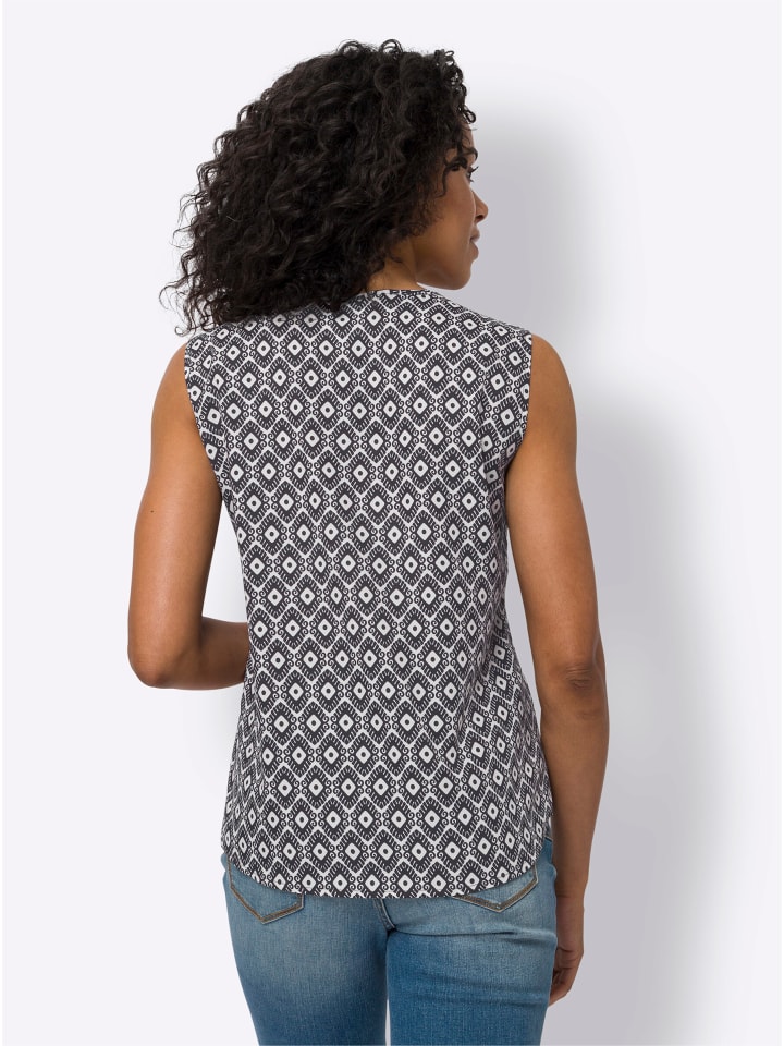 Эту блузку-топ с минималистичным узором можно носить отдельно или в составе многослойного гардероба для создания модного образа. Она невероятно универсальна. Сборки под вырезом, вытачки на груди и слегка закругленный подол.